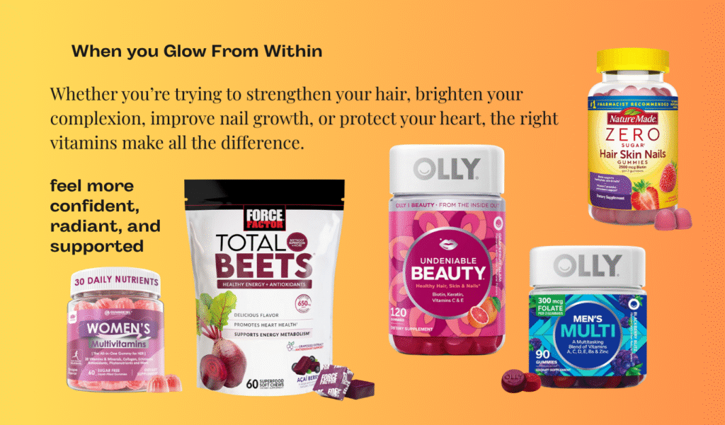 Nourish your beauty from the inside out with a daily routine that supports glowing skin, stronger nails, fuller hair, and a healthier heart. Key vitamins like biotin, collagen, vitamin C, vitamin E, and omega-3s work together to strengthen your natural glow while supporting heart function and circulation. These nutrients help boost cell repair, improve elasticity, and protect against everyday stress. When paired with a balanced diet, hydration, and consistent self-care, you’ll feel the difference in your energy, appearance, and overall wellness. Prioritize your beauty and your heart—because true health radiates from within. Start today and glow smarter.